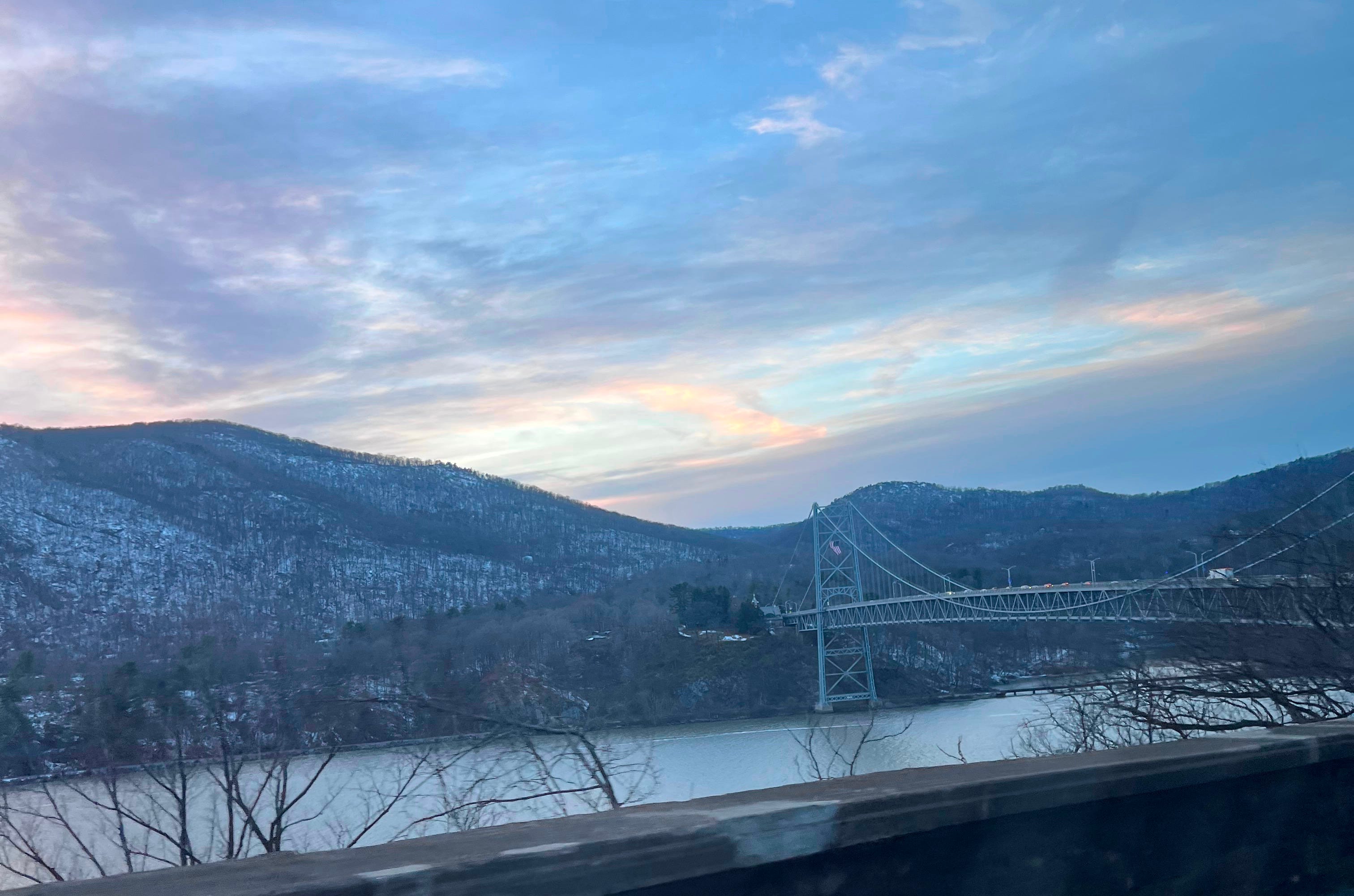 Then, almost immediately after the Town of Cortlandt sign, the trees fall away and the whole scene appears at once: only feet ahead road transforms into the deck of the Bear Mountain Bridge— for a hot minute in the mid-1920s, the longest suspension bridge in the world— and the ancient Hudson Highlands behind it. Anthony’s Nose is flush against the road; Bear Mountain sits across the river. Only then do you register the height: a 400-foot drop, held back by newer, properly cemented stone walls. A poor man’s Big Sur, climbing as it winds toward Peekskill.